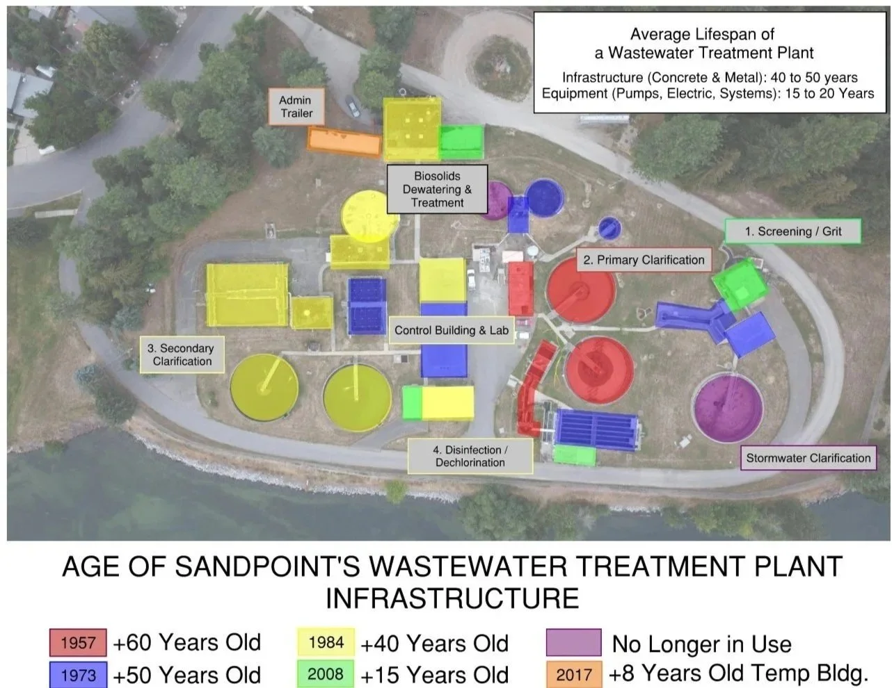The City of Sandpoint’s wastewater plant has served our community for over 70 years. Much of the equipment, built in the 1950s–80s, is at the end of its life. Pumps, clarifiers, and electrical systems are at the end of their useful life and increasingly prone to breakdown. The plant can no longer reliably meet today’s needs or keep pace with state and federal requirements to protect local waterways.