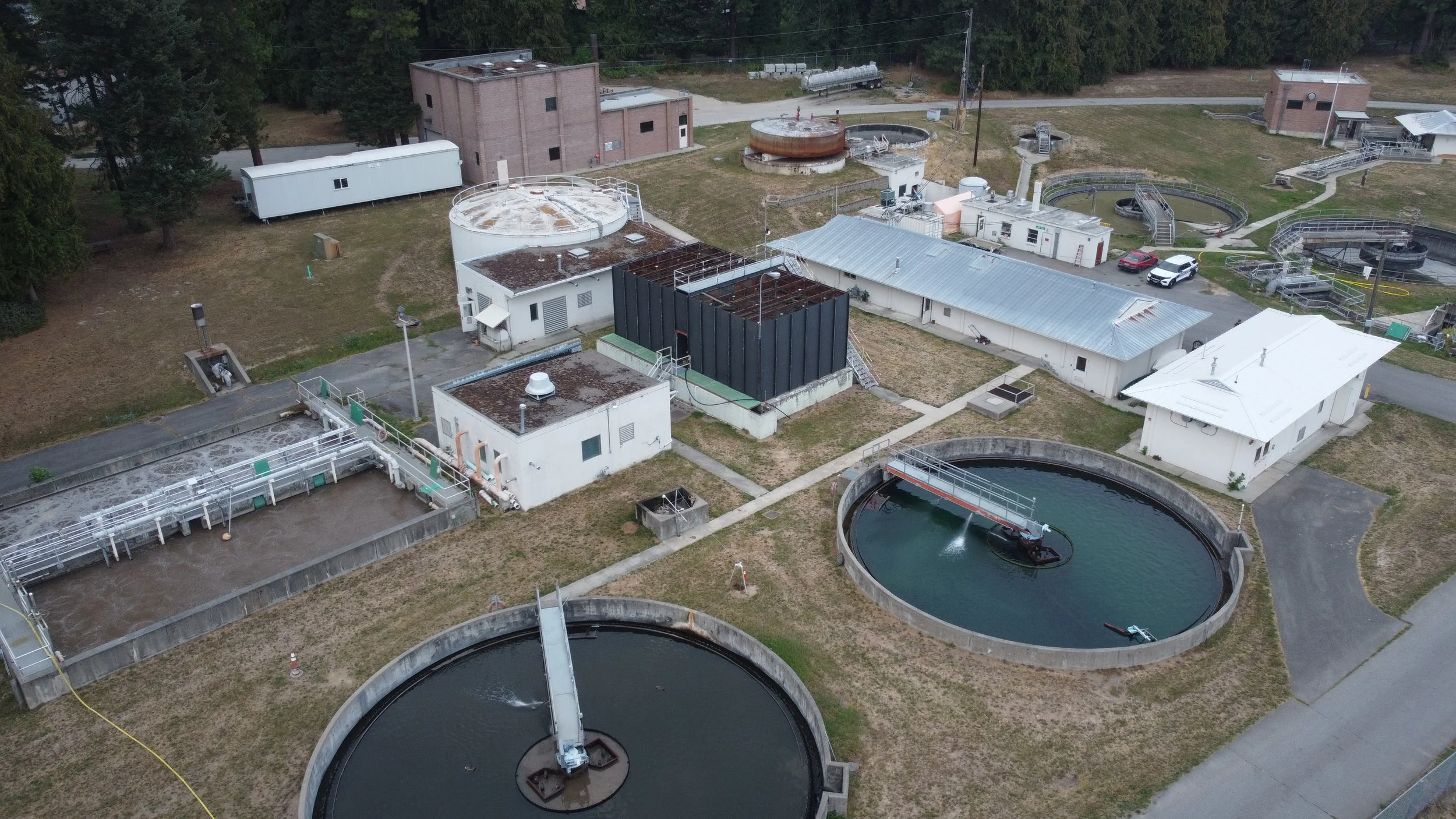 In the foreground: Secondary Clarification tanks (Built in 1984). In the background: Control Building & Lab (Built in 1973) and Biosolids Dewatering & Treatment (Built in 1984).