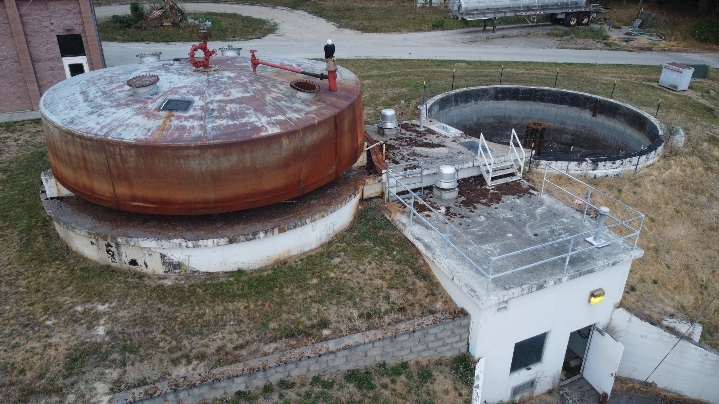 White in-ground tank on left was the Primary Digester (abandoned in 1983). It now is holding the metal lid that was originally covering the Biosolid Tank (built in 1973) on the right until the supports rusted and failed.
